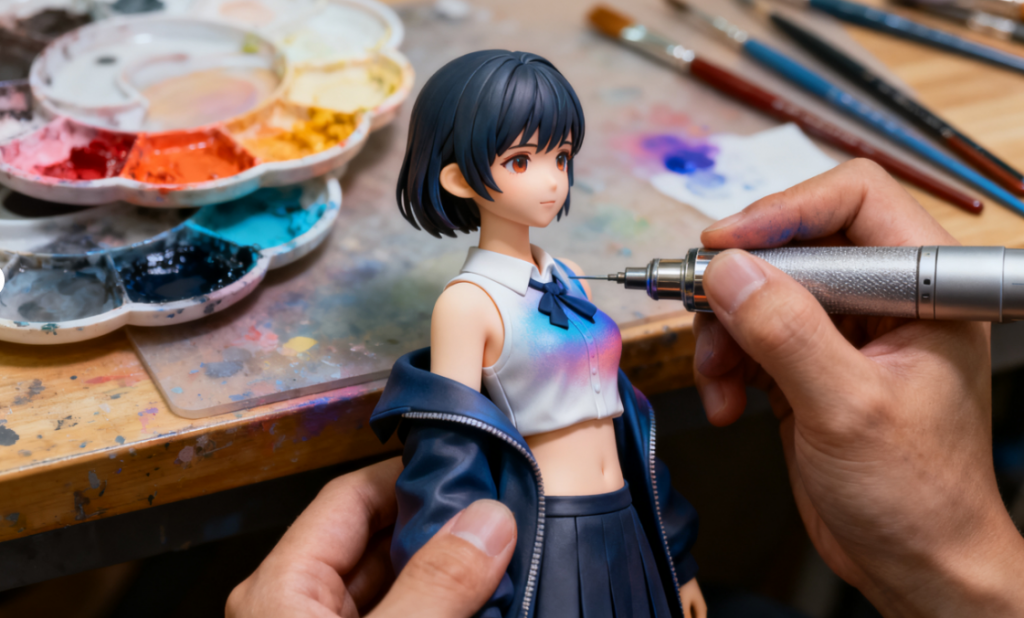 當監修定稿後,模型會進入「量產」階段。這是工藝與工業的交匯點。為了確保量產品質穩定,廠商會先製作金屬模具,用以注入PVC或ABS塑料。這些材質兼具彈性與硬度,適合批量生產。每一個零件在成型後,都要經過去毛邊、打磨與噴漆工序。塗裝師會以模板顏色為標準,確保每一批產品的色彩一致性。即使是同一款手辦,也可能因批次不同而略有差異,這也正是收藏家們津津樂道的「初版魅力」來源。量產並非完全冰冷的工序,它仍需要人手參與。比如複雜部件的組裝與最終檢品,往往仍由熟練技師完成。他們要確認每個接縫是否平整、姿勢是否傾斜、上色是否均勻。這種近乎挑剔的品質控制,是日系手辦能在全球市場中脫穎而出的關鍵原因之一。